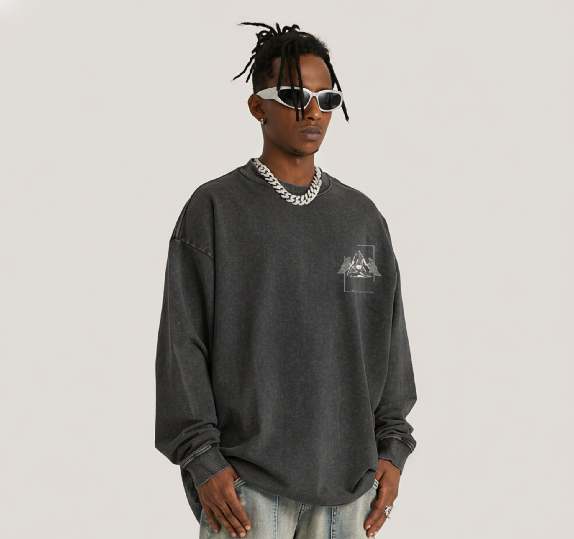 The raw hem design and washed effect lend a worn, fashionable look, perfect for those who love clothing with a distinctive, retro feel. The dropped shoulders and double-needle ribbed collar and cuffs complete the look, offering a garment with a strong visual impact.